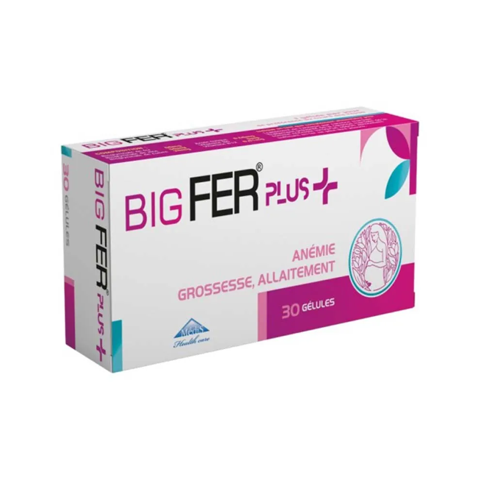BigFer Plus, avec sa formule adaptée pour la femme enceinte avec le Fer, le zinc, le cuivre mais surtout la vitamine B9…