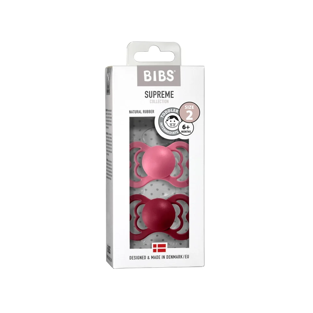 Les sucettes Bibs Supreme présentent une partie à sucer plate et la collerette rappelle un papillon. La sucette présente une valve intégrée qui permet d'évacuer l'air de la partie à sucer et de la presser à plat. La pression contre le palais et les gencives en est ainsi réduite.