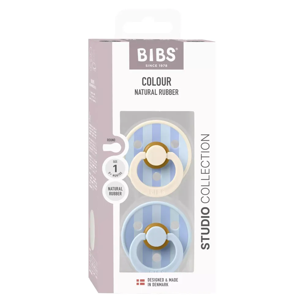 Lot de 2 sucettes Studio Colour Baby Blue Dusty Blue Mix avec tétine ronde en caoutchouc 100 % naturel. L'ensemble comprend une sucette bleu bébé et une sucette perle (ivoire), toutes deux décorées de rayures bleues (bleu poussière)