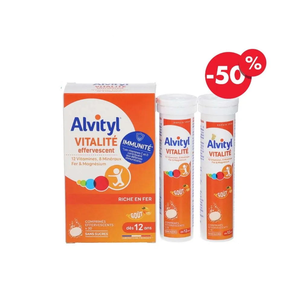 La formule d'Alvityl Effervescent (100% des AJR en vitamines et certains minéraux) est notamment riche en vitamine D et en fer qui aide à réduire la fatigue pour passer sereinement les différents caps de la vie.